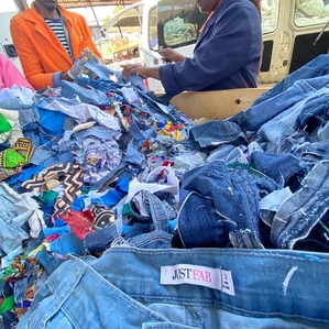Het voorbereiden van grote hoeveelheden gesorteerde materialen (acryl, wol, katoen, enz.), geschikt voor herbestemming, upcycling en recycling door de Afrikaanse creatieve scene, meubel- en textielindustrie.